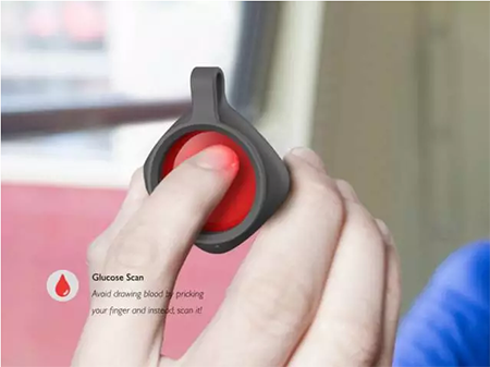 伊利诺伊大学芝加哥分校(University of Illinois at Chicago)的Hector Silva先生与该校糖尿病学专家Cynthia Fritschi博士进行合作,发明了一项可穿戴性设备。该项设备同时获得美国工业设计杂志Core77 Inc颁发的年度消费者产品奖。这个名为Flore的项目给患者提供了一个简便的血糖监测方式。这项设备使得糖尿病患者只需采用红外光谱技术对手指进行扫描,无需采血便能进行血糖监测,同时也能将用户信息实时传递给医疗服务供应商和医生。Hector Silva说,下一步的目标是和有意向的企业进行合作,继续对产品进行开发和市场化。