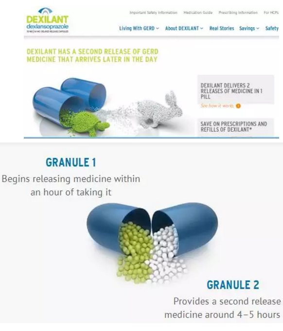 右兰索拉唑缓释胶囊为双重缓释剂型,是一种新型质子泵抑制剂。这种新型制剂胶囊内由两种类型的颗粒构成。每种类型的颗粒具有不同的 pH 依赖释放特性。部分药物在服药后 1小时内释放,部分药物在给药后 4-5 小时内的第二释放阶段释放。